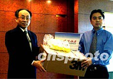 美國紐約哥倫比亞大學(xué)中國學(xué)生學(xué)者聯(lián)誼會購買了五千只世界衛(wèi)生組織推薦的N九五防護(hù)口罩,贈送給戰(zhàn)斗在抗擊非典型肺炎第一線的中國醫(yī)務(wù)工作者。二十九日哥大學(xué)生代表將口罩樣品和捐贈清單交給中國駐紐約總領(lǐng)事張宏喜(左)。作者:趙海燕