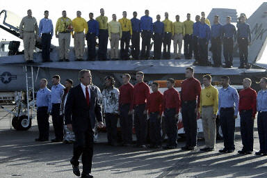 美東部時間5月1日,美國總統(tǒng)布什在從海灣返航的“林肯”號航母上發(fā)表講話,稱伊拉克戰(zhàn)爭的“主要戰(zhàn)斗行動”已經(jīng)結(jié)束,聯(lián)軍在戰(zhàn)斗中取得了勝利。