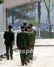 武警官兵五月二日已經(jīng)隔離北京小湯山戰(zhàn)地醫(yī)院,護(hù)衛(wèi)解放軍白衣戰(zhàn)士迎戰(zhàn)“非典”。作者:賈國(guó)榮