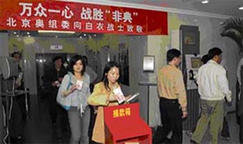 北京奧運會的申辦和籌辦工作,一直得到全國人民的大力支持。此時此刻,向戰(zhàn)斗在一線的醫(yī)務(wù)工作者奉獻愛心,是我們向社會應(yīng)做的回報。我們相信,在以胡錦濤同志為總書記的黨中央堅強領(lǐng)導(dǎo)下,在廣大醫(yī)務(wù)工作者的辛勤努力下,全國人民團結(jié)一心,眾志成城,我們一定能夠依靠科學(xué)的力量和集體的智慧,打贏非典型肺炎防治工作的攻堅戰(zhàn),奪取最后的勝利。