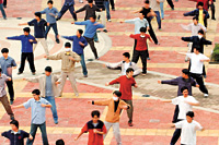 時(shí)至今日,交大校園已經(jīng)恢復(fù)了平靜,但這種平靜不似以往長(zhǎng)假學(xué)生離校后的爽快。一位交大同學(xué)對(duì)記者說,原來校園里到處都是人,現(xiàn)在該走的都走了,校園反而是最安全的地方。操場(chǎng)上,一些沒有離校的大學(xué)生做著各種體育鍛煉。
