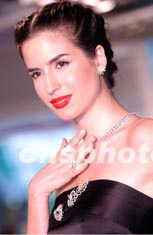 5月6日,在香港舉行的首屆中藝寶石展上,模特演繹一套“花月情緣”的寶石鉆飾鮮艷奪目。中新社記者:洪少葵