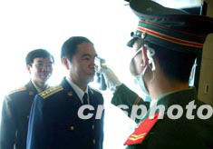 北京武警士兵五月在小湯山解放軍野戰(zhàn)醫(yī)院嚴(yán)查官兵的體溫,保證軍方的一批博士和碩士醫(yī)學(xué)專家在抗擊“非典”的戰(zhàn)役中安然無恙。中新社記者:賈國榮
