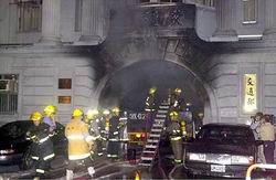 據(jù)了解,“交通部”的正門口15日晚間7時28分燃起熊熊大火,一輛掛在桃園龜山友立公司的小貨車,從桃源街又轉(zhuǎn)后即直沖“交通部”門口,駐守警衛(wèi)緊急聯(lián)絡(luò)消防人員,19輛消防車緊急趕往現(xiàn)場,火勢約在20分鐘內(nèi)撲滅,辦公室內(nèi)加班員工及數(shù)十名媒體記者所幸安然無恙,但“交通部”正門口已被兇猛的火勢燒得一片焦黑,火焰甚至高達(dá)4樓。