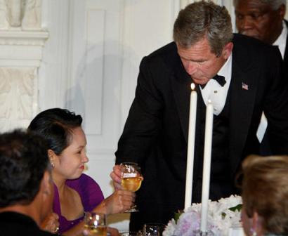 中新網(wǎng)5月20日電 據(jù)《華盛頓郵報(bào)》報(bào)道,布什總統(tǒng)在白宮為正在對(duì)美國(guó)進(jìn)行國(guó)事訪問(wèn)的菲律賓總統(tǒng)阿羅約舉行了國(guó)宴。這是布什為來(lái)訪的國(guó)家元首舉辦的第三場(chǎng)國(guó)宴,布什一般傾向于與來(lái)訪外國(guó)元首舉行非正式的宴會(huì)。