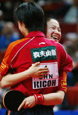 中新網(wǎng)5月25日電 象征世界女子乒壇雙打最高榮譽的波普杯,今天再一次刻上了中國人的名字。在第47屆使乒賽女雙決賽中,王楠/張怡寧技高一籌,4:1戰(zhàn)勝郭躍/牛劍峰,首次共同登頂世界最高領(lǐng)獎臺。
