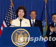 美國勞工部長趙小蘭當地時間二十九日在紐約曼哈頓出席紐約州長柏塔基(后排右二)舉行的亞裔傳統(tǒng)月活動。作者:趙海燕