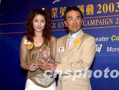 歌星陳慧琳6月2日在香港出席“職業(yè)英語運(yùn)動(dòng)2003”記者會(huì)。中新社記者 鄧慶樂