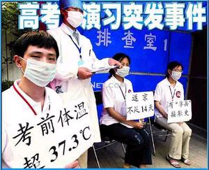 據(jù)北京青年報報道,昨天14點50分,101中學(xué)考點考生開始進入考點。由老師扮演的考生一一走過“驗證處”,老師進行嚴密排查,不久,“忘帶健康卡”、“考前體溫超過37.3攝氏度”、“返京不足14天”、“有‘非典’接觸史”、“健康卡兩章不全”、“忘帶準考證”等各種“問題考生”舉著醒目的標牌,在引導(dǎo)老師的帶領(lǐng)下一一被臨時“安置”!皢栴}考生”的問題得到解決后,與其他考生一樣進行體溫測試。進入校門的考生在工作人員的指引下,先在臨時洗手池洗手消毒,然后按照考場示意圖去考場位置。