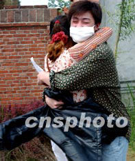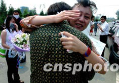 北京一位母親六月三日上午在小湯山戰(zhàn)地醫(yī)院門前,終于盼到患“非典”住院一個(gè)多月的兒子痊愈出院,母子頓時(shí)激動地緊緊擁抱在一起。中新社記者:賈國榮