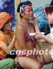 六月四日,香港赤柱舉行龍舟錦標(biāo)賽,圖為美女“運(yùn)動員”彩繪美體,盛裝出席龍舟賽。 中新社記者 潘索菲