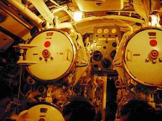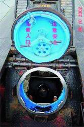打開潛艇前部的一個(gè)艙蓋,只看到舷梯下面一片昏暗。這樣的進(jìn)出艙口,在潛艇上部共有3個(gè)。艙口的直徑也就0.6米到0.7米寬,剛剛夠一個(gè)成年人進(jìn)出。從陽光燦爛的露天走下舷梯,眼前一團(tuán)漆黑,過了一會(huì)兒,漸漸才能看見艙內(nèi)密布的儀表、管道、閥門。原來,為了節(jié)約能源和適應(yīng)水下作業(yè)的壓力,潛艇內(nèi)使用的都是光線昏黃的防爆燈,燈泡的外面還用小拇指寬的鐵條箍住。