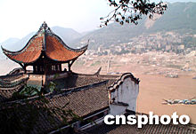 中新網(wǎng)6月9日電 中廣網(wǎng)消息:今天(6月9日)三峽工程正式蓄水進(jìn)入第九天,上午八點(diǎn),重慶庫區(qū)巫山水位達(dá)到130·76米,張飛廟正式進(jìn)水,遺址前“大江保障”、“浩氣長存”兩幅摩巖題刻已經(jīng)沉入江中。與張飛廟隔江相望、有著1400多年歷史的云陽老縣城也正被江水?dāng)埲霊驯,三點(diǎn)五公里長的環(huán)城路已全部沉入江底。