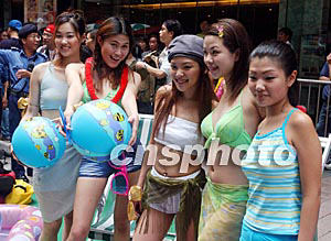 為刺激消費(fèi)市道和營造復(fù)蘇氣氛,香港從六月八日起在灣仔駱克道舉行星光之夜活動。圖為數(shù)十名模特穿上泳裝在街頭巡游。潘索菲 攝
