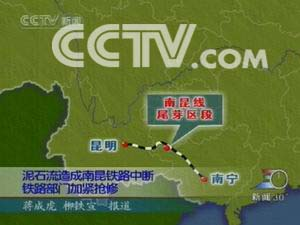 據(jù)中央電視臺(tái)報(bào)道,9日零時(shí),因連降暴雨,南昆鐵路尾芽區(qū)段多處被泥石流掩埋道床、沖空線路。尤其是總長(zhǎng)3公里的盤龍山隧道口塌下1萬(wàn)立方米的泥石流,導(dǎo)致近百米線路被掩埋,厚度達(dá)6米,隧道內(nèi)有一公里多線路嚴(yán)重積水,有些險(xiǎn)段搶險(xiǎn)人員一時(shí)無(wú)法接近,給搶險(xiǎn)工作增加了很大難度。