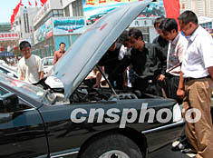 六月,北京“非典”疫情逐步得到控制,北方汽車交易市場(chǎng)客流量回升,十萬元左右的轎車銷路看好。圖為汽車銷售人員正在為用戶介紹國(guó)產(chǎn)轎車的性能。中新社記者 張勤 攝