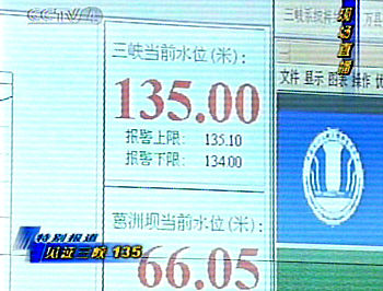 三峽水利樞紐梯級調度通信中心的大屏幕顯示水位達到135米。