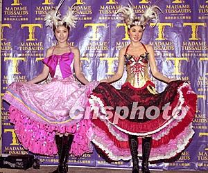 歌星陳慧琳6月11日在香港山頂杜夫蠟像館親自為其蠟像揭幕,她與其蠟像均特意挑選于去年在演唱會所穿的Can Can舞衣作為蠟像服飾。鄧慶樂 攝