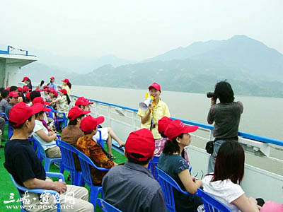 九點二十時,三輛豪華大巴緩緩駛進(jìn)秭歸港。車剛停住,第一批一百多名頭帶紅帽的三峽高峽平湖游客,就急急走出汽車,不停地舉起手中的相機。冰凍了近兩個月的三峽旅游在一片閃光燈中解凍。