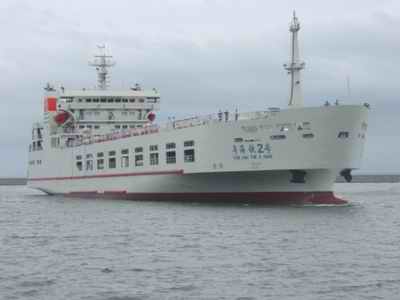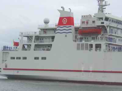 據(jù)了解,“鐵二號”從設(shè)計到造型、從長相到身材,幾乎和“鐵一號”沒有什么差異?傞L度一百六十五點四米,寬二十二點六米,排水量一萬二千四百噸,載車重量四千二百噸,主甲板可以載貨運列車車廂四十節(jié)或客運列車十八節(jié)、旅客一千三百六十人。