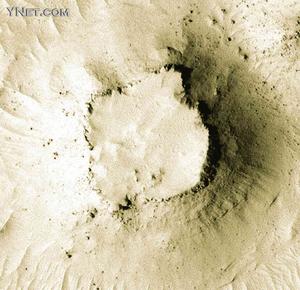 這是美國宇航局六月十六日公布的“火星環(huán)球勘測者”號探測器拍攝的火星地貌照片。照片上顯示一處小型環(huán)形臺地,周圍是塵土覆蓋的小丘及波紋狀平原,臺地的斜坡上布有塊狀浮石。