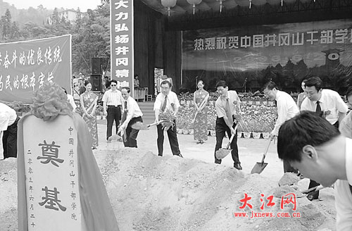 在開工典禮上,賀國強(qiáng)和省委書記孟建柱共同為江澤民題寫的“中國井岡山干部學(xué)院”院名揭牌。賀國強(qiáng)發(fā)布開工令,并和大家一道為工程奠基。