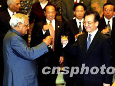 中印雙方二十三日在北京簽署有關簡化簽證手續(xù)的諒解備忘錄等九個文件,中國國務院總理溫家寶與印度總理瓦杰帕伊舉杯祝賀。中新社記者:鄭萍萍