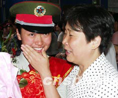 六月二十四日,完成北京小湯山戰(zhàn)地醫(yī)院抗擊非典任務(wù)的蘭州軍區(qū)白衣戰(zhàn)士凱旋。在蘭州車站,一位母親為女兒擦去激動的淚水。 作者:楊曉波
