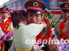 完成北京小湯山戰(zhàn)地醫(yī)院抗擊“非典”任務(wù)的蘭州軍區(qū)白衣戰(zhàn)士二十四日順利回到蘭州。在蘭州車站,一名軍醫(yī)與家人久別重逢,不禁熱淚盈眶。作者:杜洋