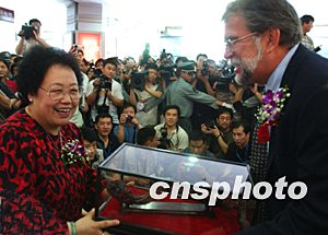 WHO駐華顧問(wèn)羅伯特.帝茲接收全國(guó)政協(xié)委員、中國(guó)紫檀博物館館長(zhǎng)陳麗華女士贈(zèng)送的紫檀木雕如意,接收這份各界感謝WHO支持中國(guó)戰(zhàn)勝SARS病毒的心意。中新社記者:賈國(guó)榮