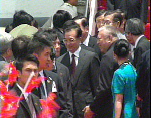中新網(wǎng)6月29日電 中國國務院總理溫家寶今天11:50時許乘專機抵達香港國際機場。香港特區(qū)行政長官董建華等到機場迎接。