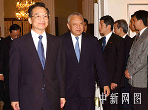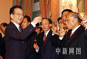 六月二十九日,國務院總理溫家寶在香港見證“內地與香港更緊密經(jīng)貿關系安排”簽字儀式,圖為溫家寶在簽字儀式上向香港知名人士祝酒。中新社記者 潘索菲 攝