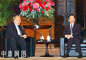 國(guó)務(wù)院總理溫家寶6月29日在下榻的酒店,會(huì)見特首董建華并與工商界知名人士親切交談。洪少葵 攝