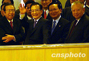 國務(wù)院總理溫家寶在香港特首董建華陪同下,六月三十日下午到香港交易所參觀,港交所主席李業(yè)廣(左)向溫家寶介紹交易所運作情況。中新社記者 錢興強 攝