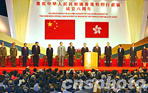 中新網(wǎng)7月1日電 香港特區(qū)政府今天上午在會展中心舉行盛大酒會,隆重慶祝香港回歸祖國六周年。多個民間團(tuán)體也將舉辦一連串活動,祝賀及見證今日盛事。
