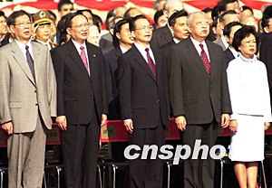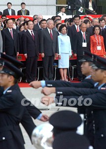香港灣仔金紫荊廣場今早舉行升旗儀式。當(dāng)國務(wù)院總理溫家寶在特區(qū)行政長官董建華陪同下步入廣場時,全場響起熱烈的掌聲。升旗儀式有三千名嘉賓參加,由香港警察銀樂隊奏樂。