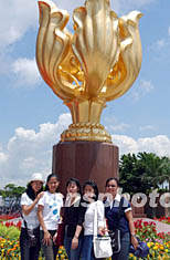 隨著內(nèi)地、香港SARS疫癥的平息,來香港旅游的觀光客明顯增多,圖為游客在金紫荊廣場留影拍照。中新社記者 錢興強 攝
