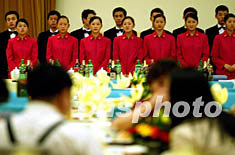 四日晚,整裝待命的侍應(yīng)生在人民大會(huì)堂金色大廳內(nèi)迎候來京旅游的香港和韓國(guó)、澳大利亞的549名游客。北京旅游局從即日起將陸續(xù)在大會(huì)堂宴請(qǐng)北京“雙解除”后的境內(nèi)外游客。中新社記者 鄭萍萍 攝