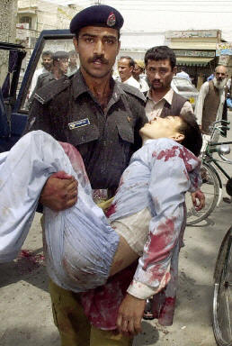 巴基斯坦西南部城市基達(dá)的一個什葉派穆斯林的清真寺內(nèi)4日發(fā)生自殺爆炸事件,至少15人死亡,數(shù)十人受傷。圖為巴基斯坦警察正在運(yùn)送受傷人員。