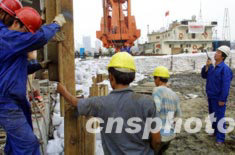 上海軌道交通4號線滲水事故搶險工作五日繼續(xù)進行,搶險人員打樁加固一度被黃浦江潮水沖出缺口的防汛堤壩。作者:湯彥俊
