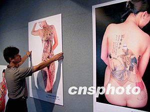 在廣州美術(shù)館內(nèi),龐國華和朱賢龍十日向媒體展示了他們合作的人體彩繪攝影作品。他們的作品以女性人體之柔美配之相應(yīng)的肢體語言和攝影元素,給人一種耳目一新的感覺。作者:羅仰明