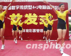 七月十二日,海南省率先在全國(guó)推出“四加一”體育彩票新玩法。在?诮鹗兰o(jì)廣場(chǎng)舉行的首發(fā)儀式上,模特跳舞表演助興。作者:王辛莉