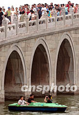 七月十三日,北京頤和園著名景點(diǎn)十七孔橋上人頭攢動(dòng)。當(dāng)天,實(shí)行優(yōu)惠票價(jià)的頤和園迎來(lái)“非典”疫情后的最高客流量。中新社記者:張煒