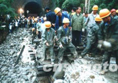 7月13日,位于陜西省西部的寶雞地區(qū)大雨滂沱,致使寶成鐵路寶雞境內(nèi)的觀音山車站南約500米處發(fā)生險情,一處隧道被堵住,并有多處路基被沖跨。西安鐵路工程集團(tuán)公司等單位千余名員工和武警官兵及當(dāng)?shù)厝罕妸^力搶險,使寶成鐵路在14日上午恢復(fù)通車。作者:霍倪
