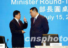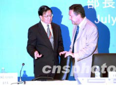 博鰲亞洲論壇秘書長龍永圖(左)及世界旅游組織秘書長弗朗加利,7月15日在香港主持“新形式下國際旅游合作大會”的部長圓桌會議。中新社記者:洪少葵
