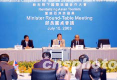 2003年7月15日,張家界市長魯平益在香港出席“新形式下國際旅游合作大會”之際,推介張家界旅游產(chǎn)業(yè),并與業(yè)界人士共同探討重振亞洲旅游業(yè)的辦法和途徑。中新社記者:洪少葵
