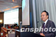 澳門社會事務(wù)及文化司長崔世安在香港出席“新形式下國際旅游合作大會”部長圓桌會議時(shí),不忘向業(yè)界人士推介澳門旅游業(yè)。中新社記者:洪少葵