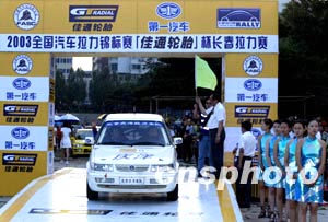 因受“非典”影響而推遲的中國汽車拉力賽第二站比賽15日晚移師吉林省長春市,來自全國的56輛賽車參加本次比賽,吉林省省長洪虎為北京慶洋車隊著名車手任志國揮旗發(fā)車。中新社記者:趙振清