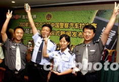 2003都寶鋁箔工業(yè)杯中國(guó)警察汽車?yán)惼咴率赵诒本┡e行天安門(mén)首發(fā)儀式新聞發(fā)布會(huì)。賽事匯聚了包括香港、澳門(mén)在內(nèi)的八十名中國(guó)警界精英,是中國(guó)建國(guó)以來(lái)規(guī)模最大、范圍最廣、距離最長(zhǎng)的一次警察汽車賽事。圖為發(fā)布會(huì)上參賽代表斗志昂揚(yáng)。中新社記者:武仲林