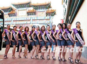 二○○三年紐約華裔小姐選美會(huì)決賽入圍佳麗日前到首都華盛頓探訪當(dāng)?shù)貎S團(tuán),并參觀國會(huì)山莊。圖為眾佳麗在華盛頓中國城牌坊前合影。作者:龔高